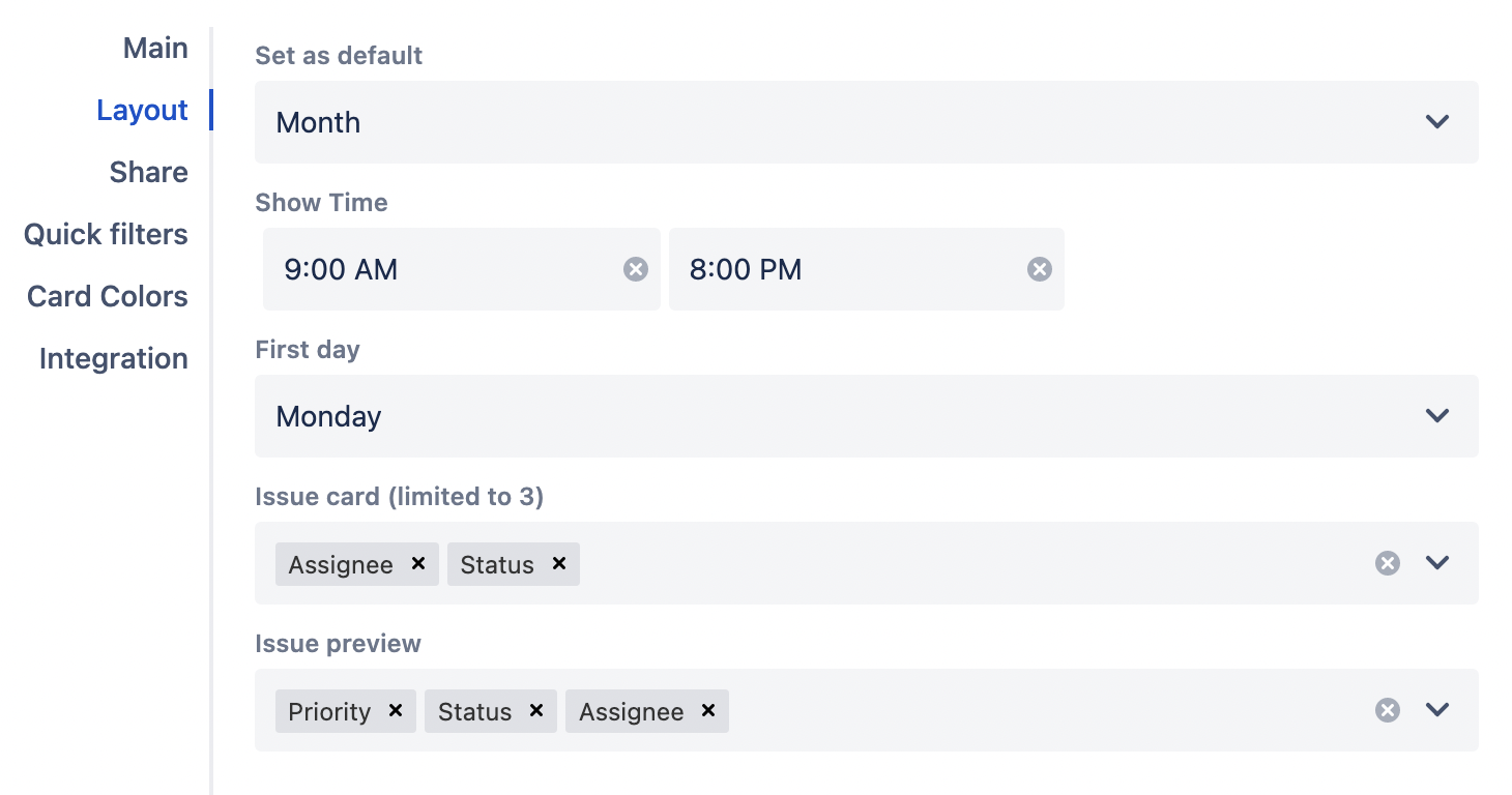 Each calendar renders issues using the values you specify as the event start and finish. This setting defines which issue fields must be taken as timeframes. There are several modes you can use.