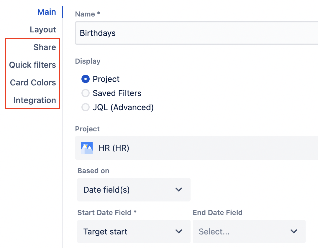 The Main and the Layout settings are required during the calendar creation, other settings are only available for already existing calendars (click the cog icon).