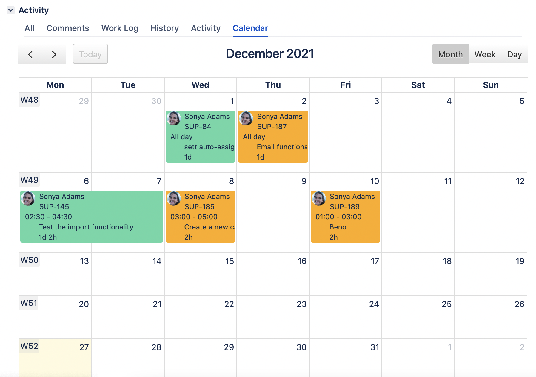 If enabled globally and you were granted permissions to browse the app, you will be able to see the Calendar tab in the issue Activity section. It displays the other issues of the project assigned to the current issue assignee, in case their start and end dates are specified (the issues are planned).
