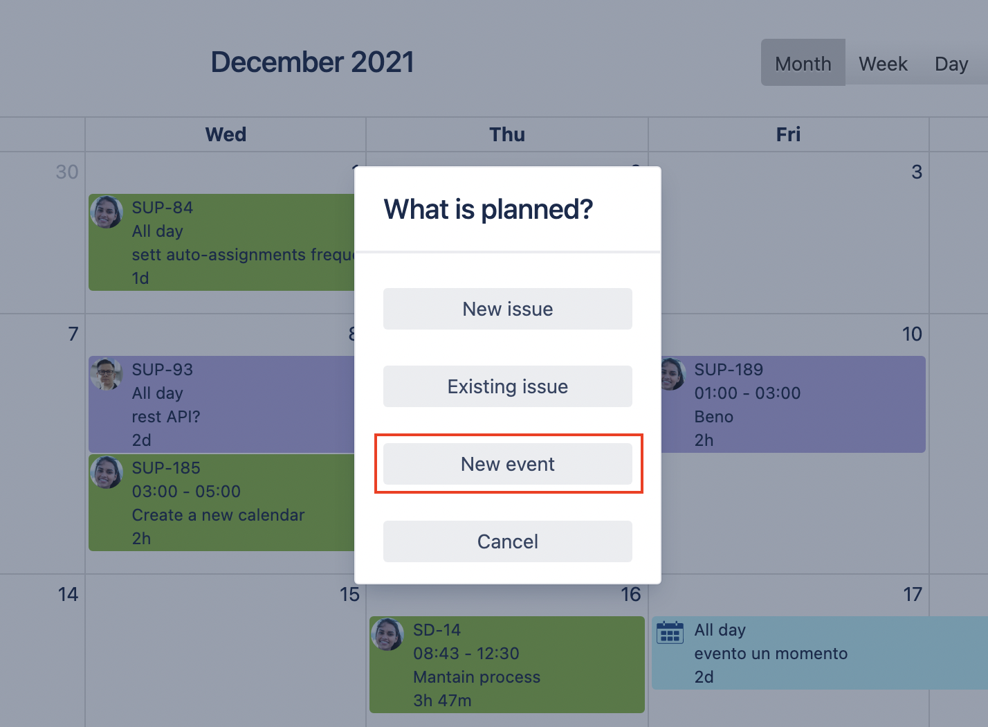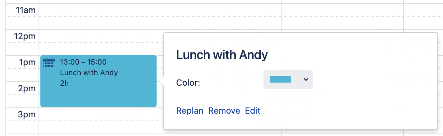 A calendar can consist not only of Jira issues but of non-Jira events as well. Click at the date-time you would like to add an event and select the New event option. The event will appear only in this particular calendar.
