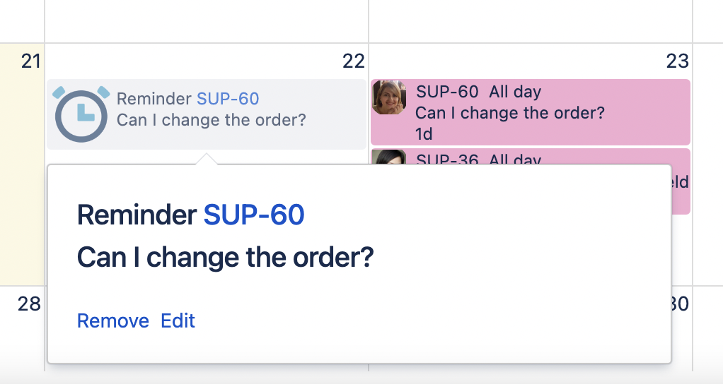 If a user has permission to edit and delete a reminder, they can perform those actions directly in the Calendar.