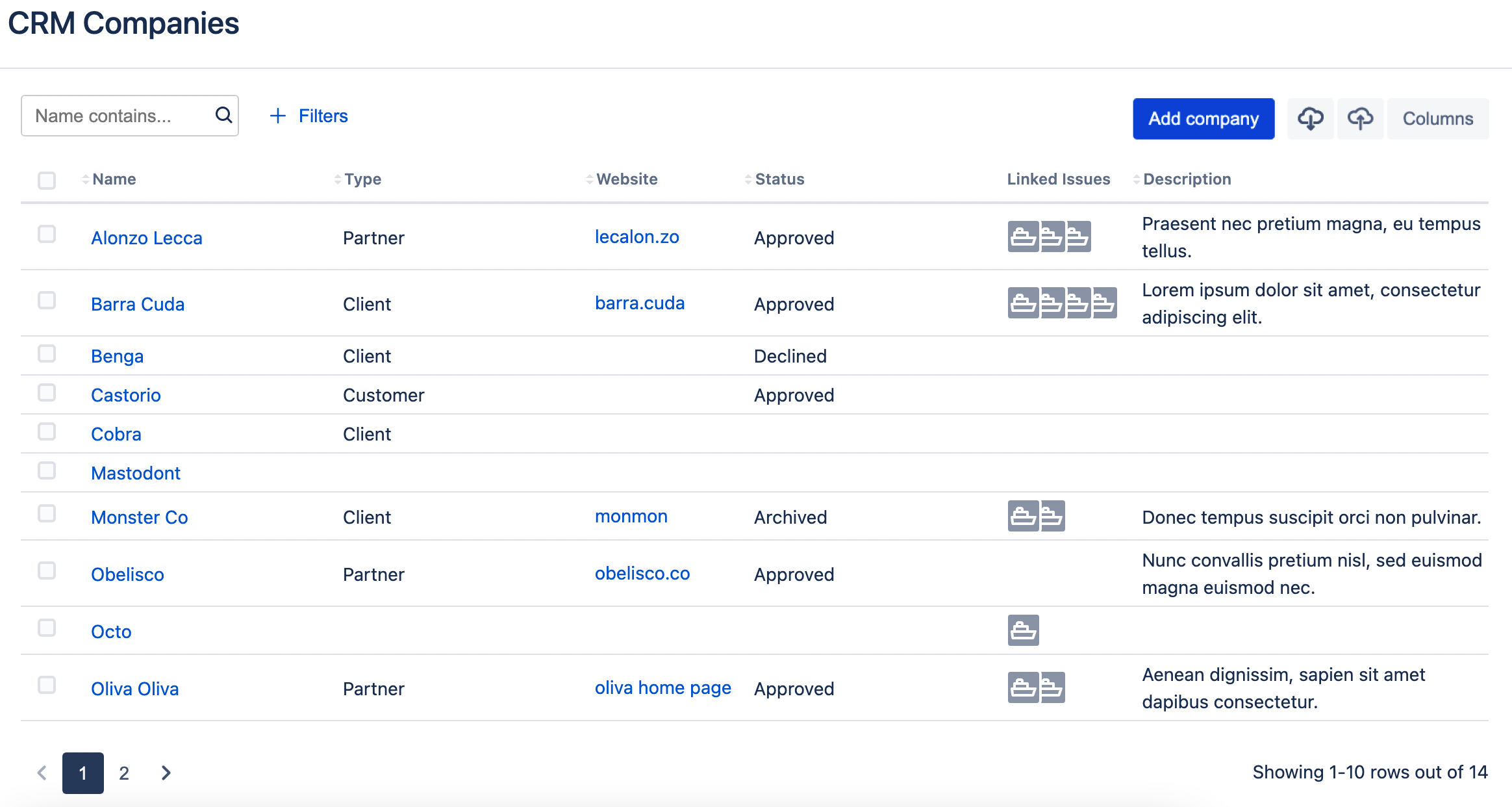 Navigate to Apps → CRM → Companies to access the full list of Companies. Here is a quick view of companies that displayed as a table. Click on a company to open its card and browse all parameters.