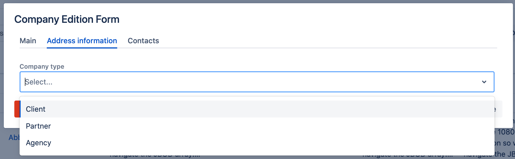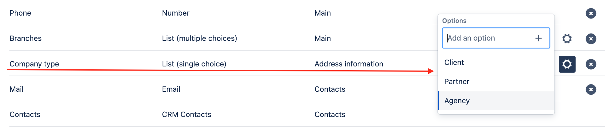 List (single choice) | Used for selecting one value from the cascading list. For example, "Company type": Client, Partner, Agency. Possible options should be set up in Layouts, in a field using cogwheel: ![]() Attribute in the company card: ![]() |