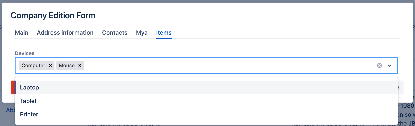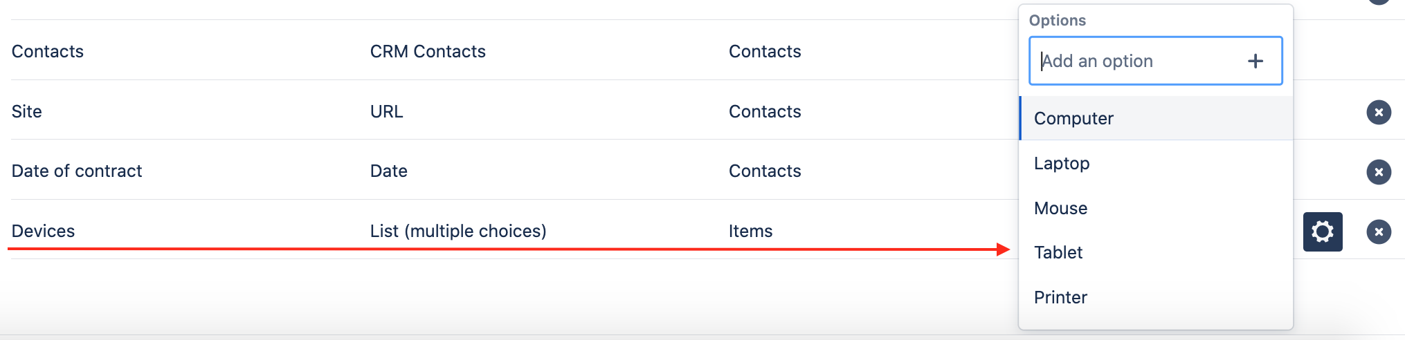 List (multiple choices) | Used for selecting several values from the cascading list. For example, "Devices": Computer, Laptop, Tablet, Mouse, Printer. Possible options should be set up in Layouts, in a field using cogwheel: ![]() Attribute in the company card: ![]() |