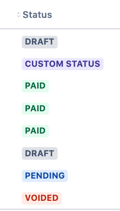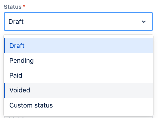 Status | Mandatory attribute that defines the status of transaction. Predefined statuses that can not be deleted: Draft (set as default), Pending, Paid, Voided. Adding new optional statues according to your needs is allowed. Works as a select list (single) with predefined colors: