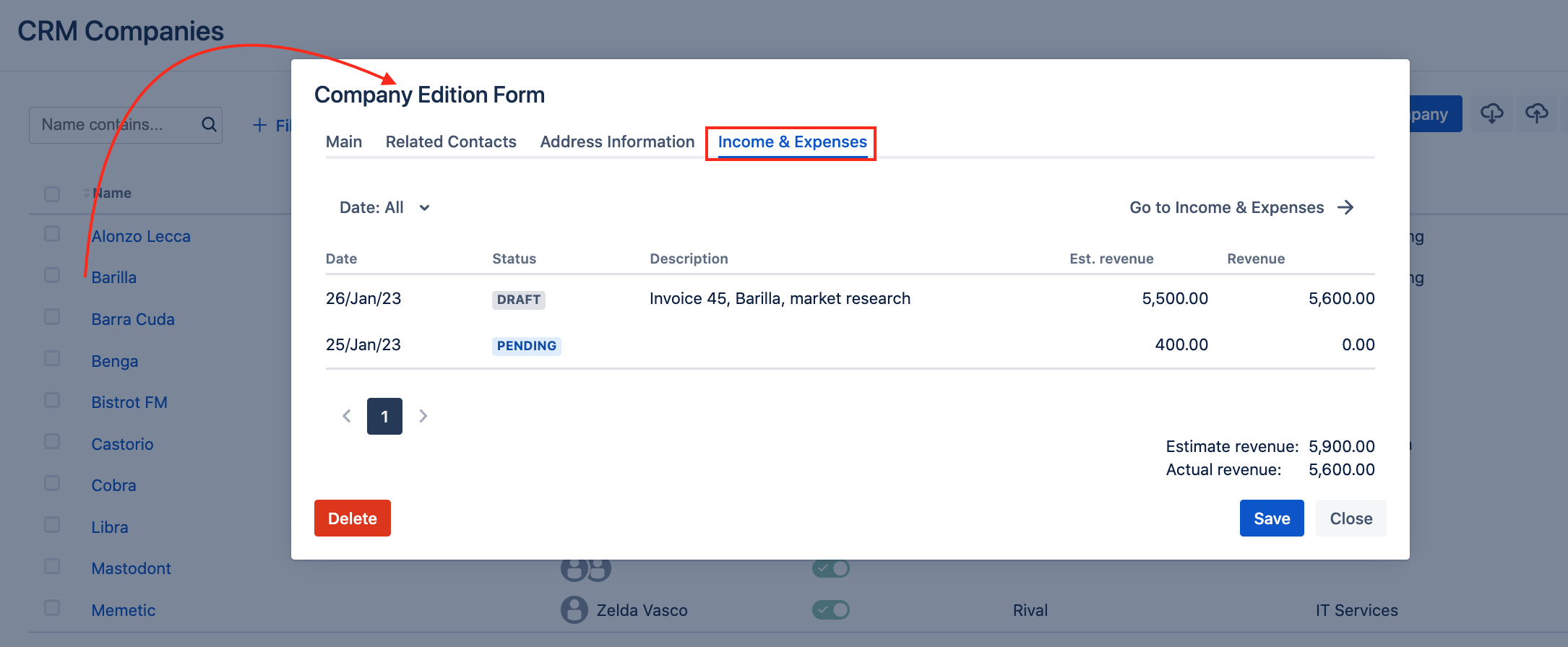 Once CRM installed, you can find Income & Expenses section in a Company card.