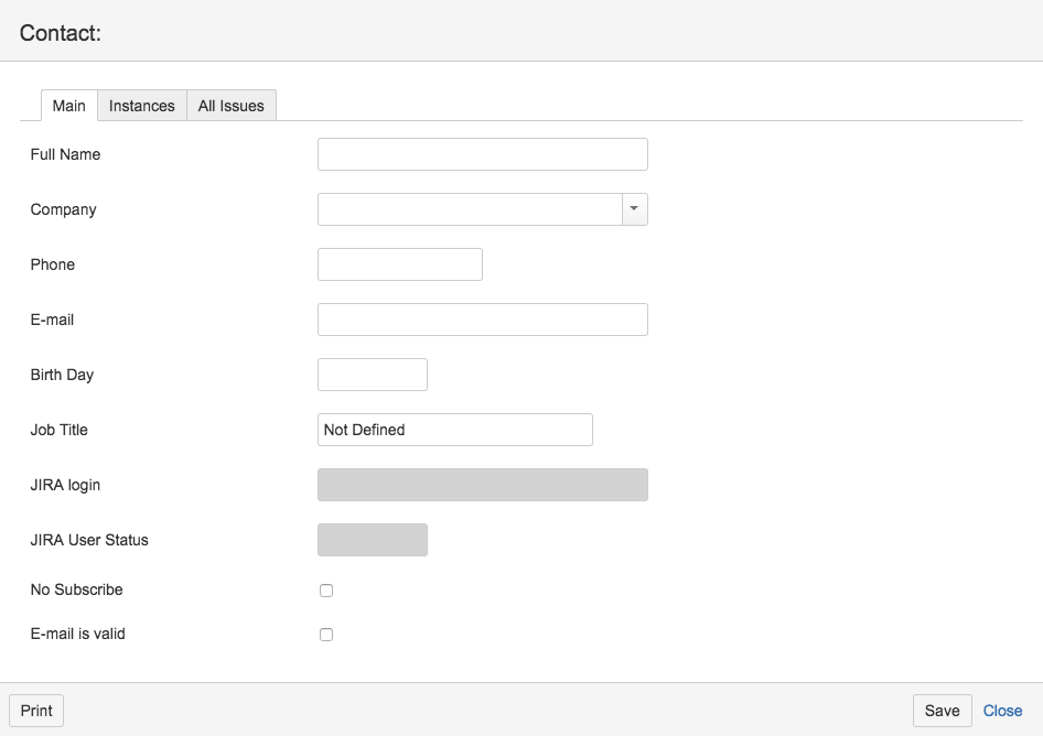 Fill it with needed information and press 'Save'. New contact will be added to CRM Contacts Directory, new JIRA-user will be created and this new user will appear as reporter of the issue.