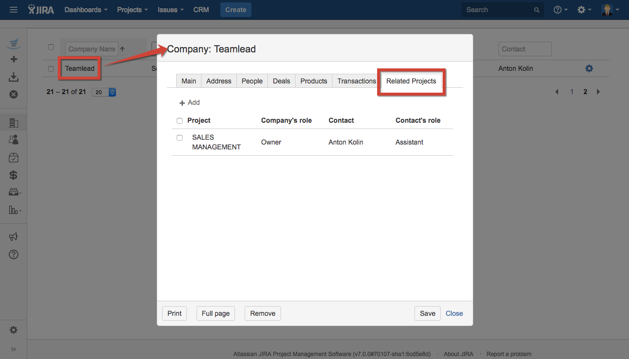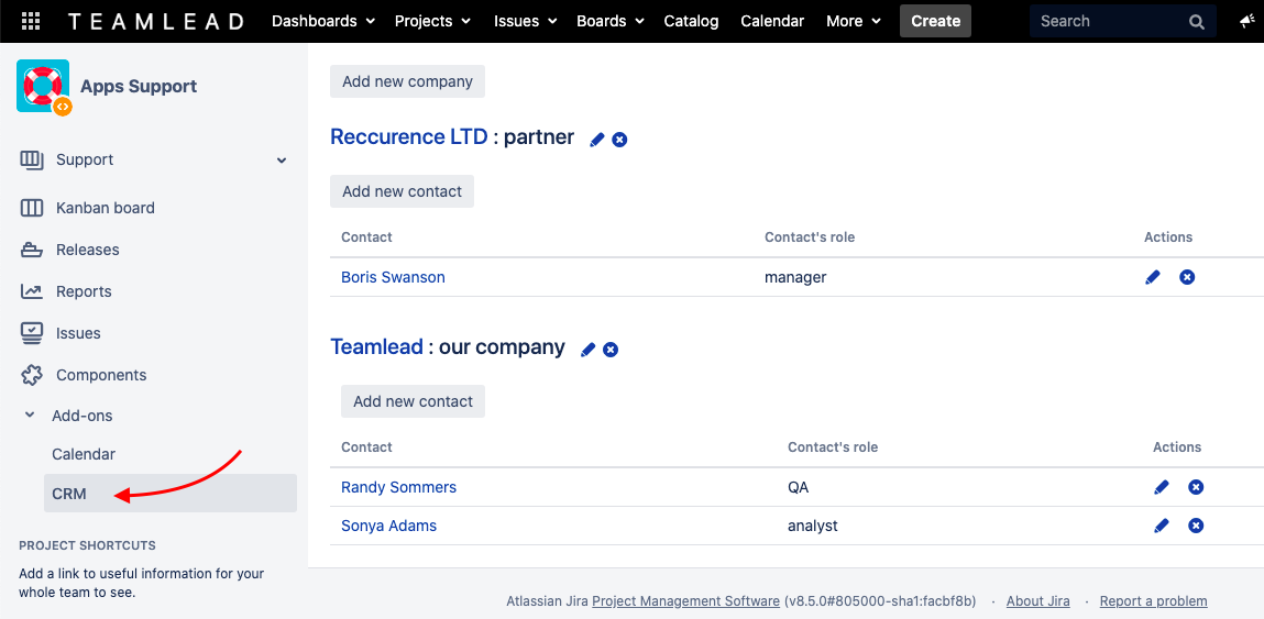 The CRM app provides the project section that is available by default in each Jira project. This section is intended to show the related Companies and Contacts from the full list of the global section.