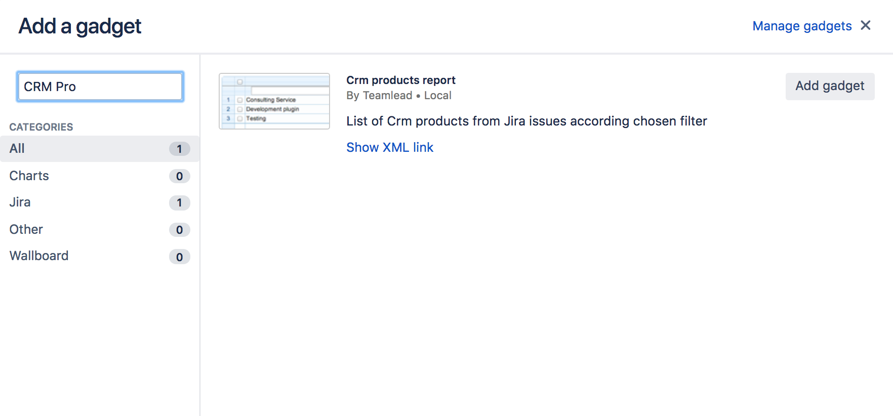 Find 'CRM products report' in gadgets list