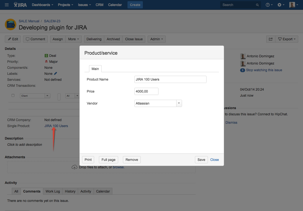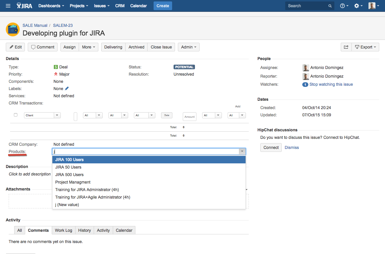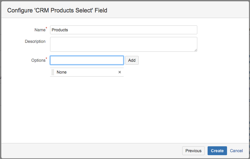 Custom field CRM Products Select allows to add one or more products from CRM Products Directory to Issue screens and to Service Desk Custom Portal. CRM Single Product Select field is the same but only one product can be selected.