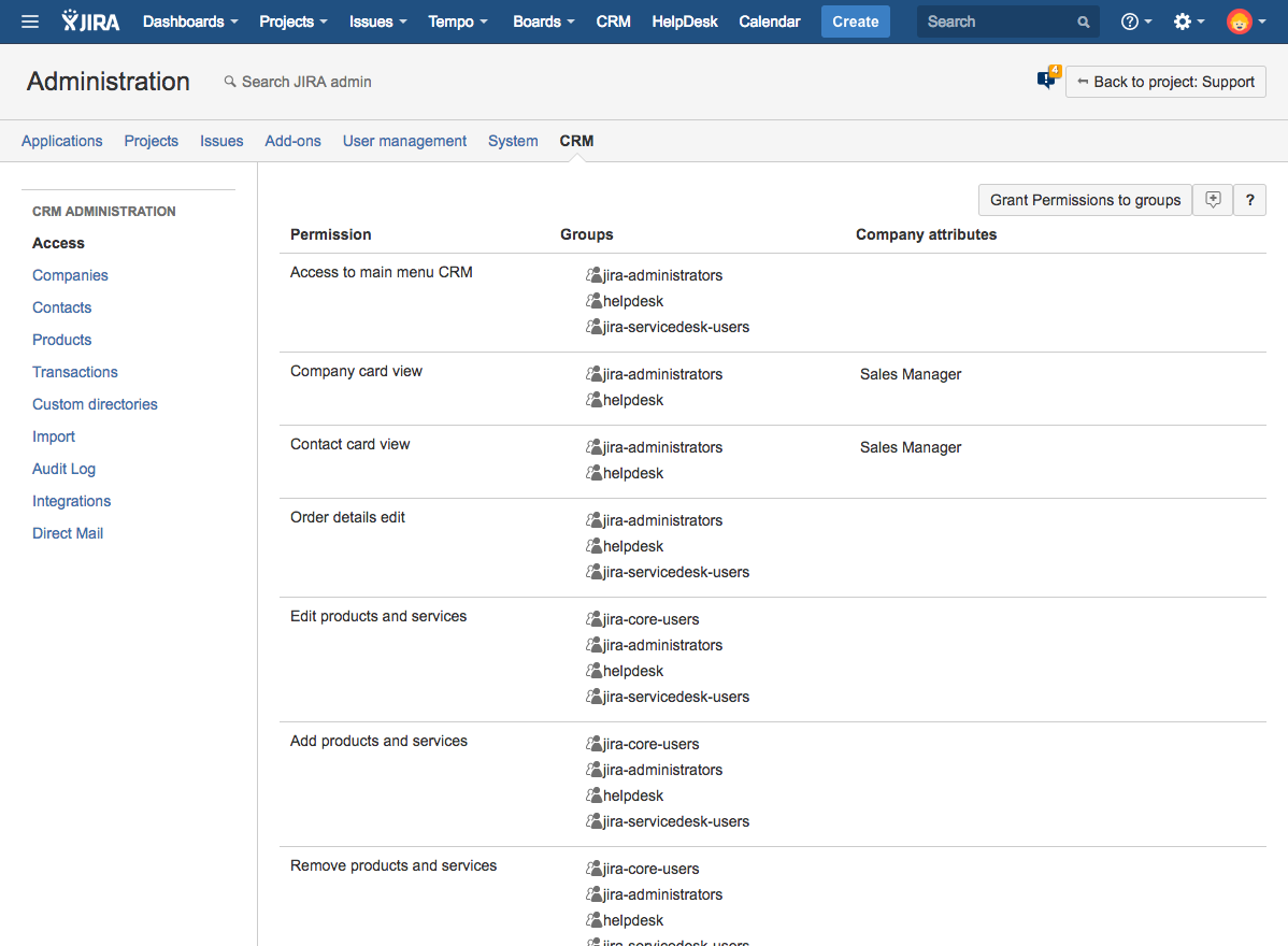 After plugin installation, you must set up access to plugin's objects and features, otherwise, your users will not see the CRM menu and the directories.