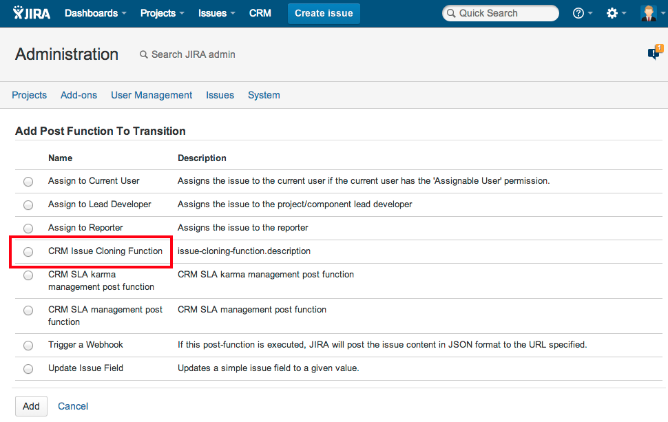 We can clone issues with CRM plugin. Just add a special post-function to your own workflow transition: