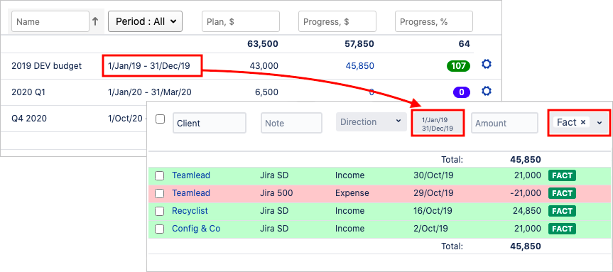 In the example below, the 43k plan was added manually, the 45,850k progress is the sum of fact-transactions for the specified period. The dates are selected as an additional filter.