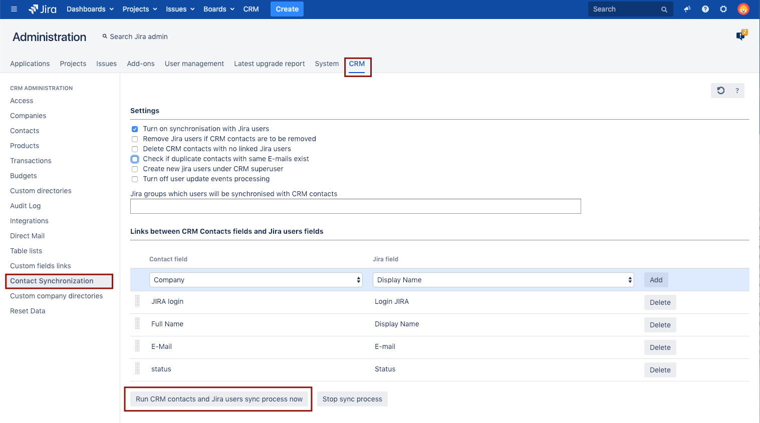 4. Click on "Run CRM contacts and JIRA users sync process now".