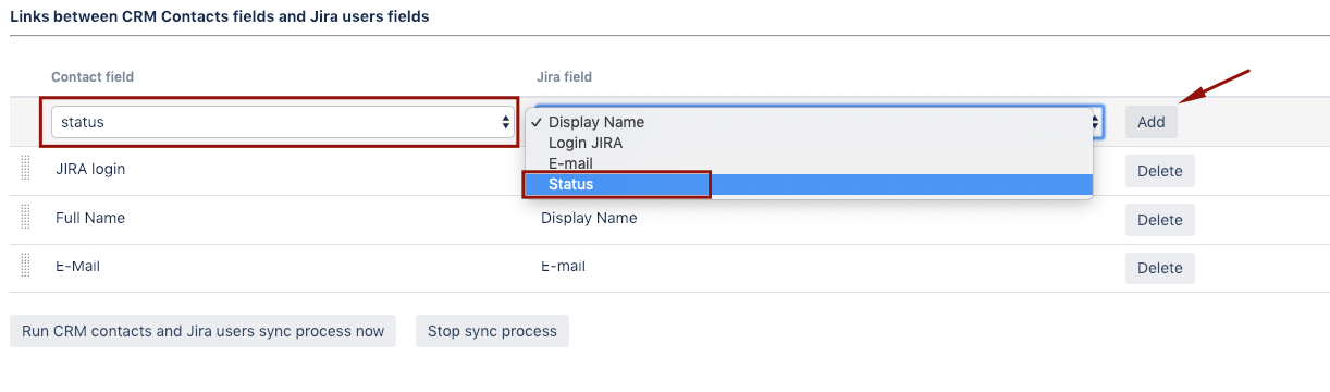 To synchronize CRM Contact's status with JIRA user status create new attribute Checkbox Type for contacts in CRM Administration/Contacts/Contacts Attributes as a status of contact. Next step is to link contact's status to JIRA user Status field.
