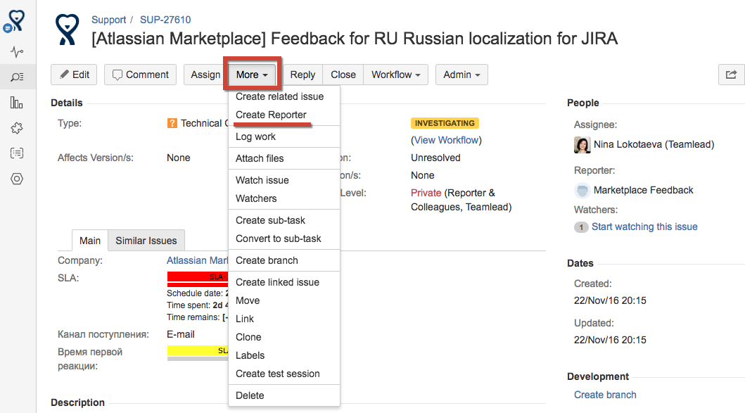 Fill it with needed information and press 'Save'. New contact will be added to CRM Contacts Directory, new JIRA-user will be created and this new user will appear as reporter of the issue.