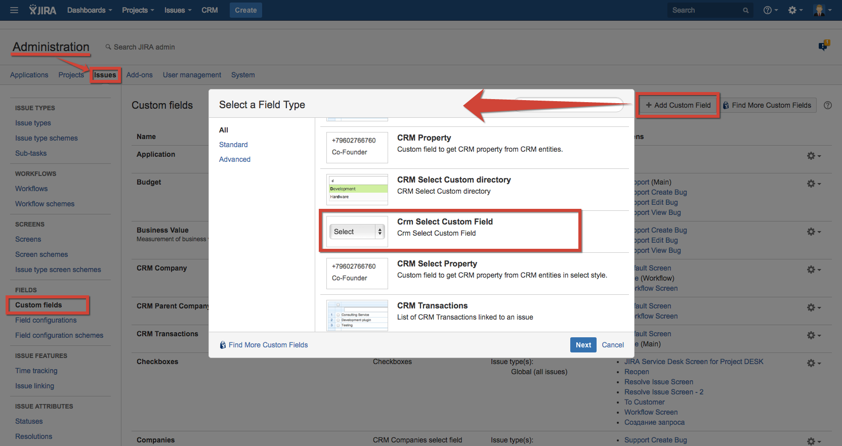 You can set CRM Select Custom Field in Administration menu/ Issues/ Custom fields. Click on "Add Custom Field" and select CRM Select Custom Field type: