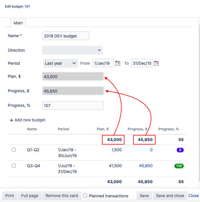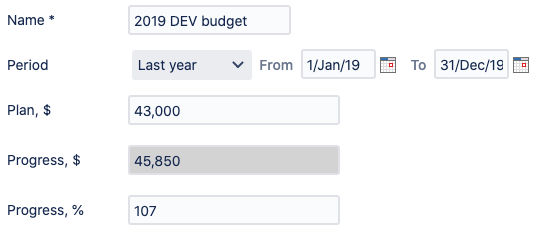 In the example below, the 43k plan was added manually, the 45,850k progress is the sum of fact-transactions for the specified period. The dates are selected as an additional filter.