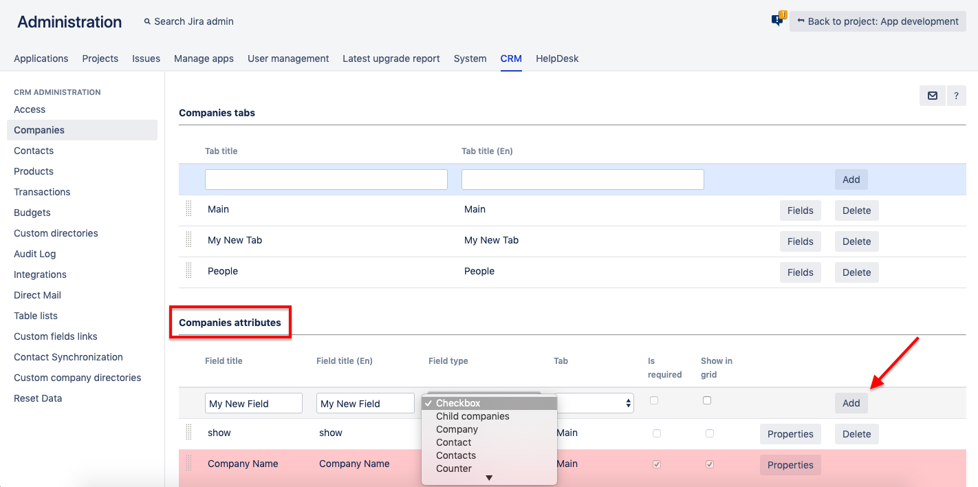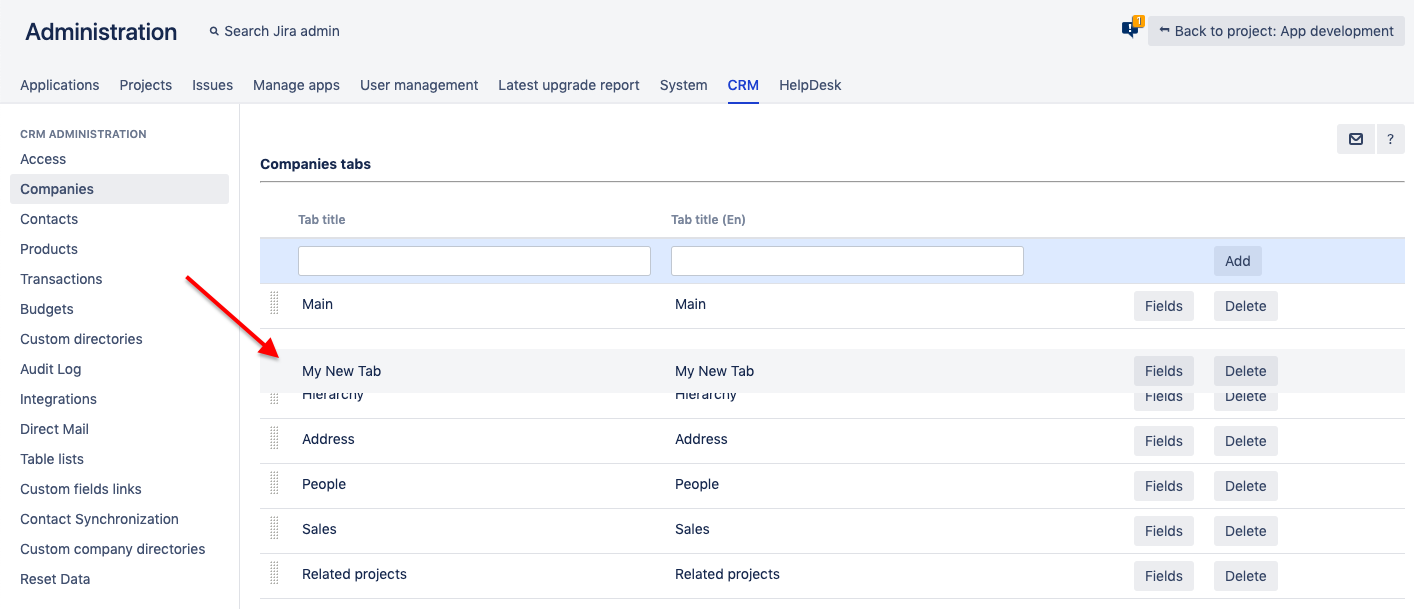 Navigate to CRM Administration → <required directory> and add a new tab specifying the tab name.