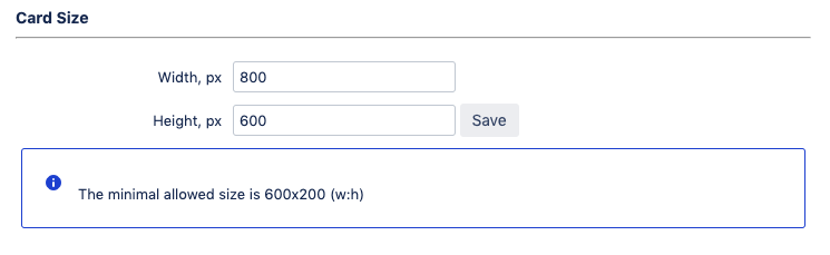 Your card may contain many attributes. Specify its size to make the card more convenient for users. The minimal allowed size – to find room to all predefined buttons – is 600x200 (w:h)