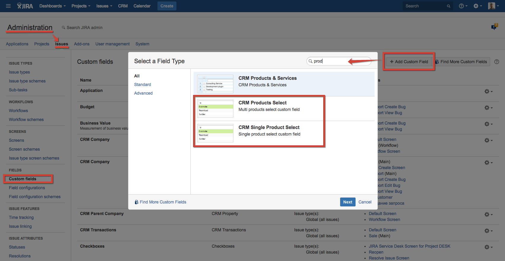 Custom field CRM Products Select allows to add one or more products from CRM Products Directory to Issue screens and to Service Desk Custom Portal. CRM Single Product Select field is the same but only one product can be selected.