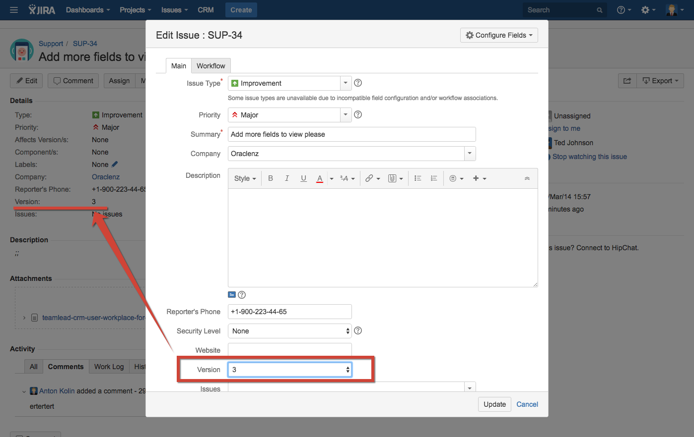 You can set CRM Select Custom Field in Administration menu/ Issues/ Custom fields. Click on "Add Custom Field" and select CRM Select Custom Field type: