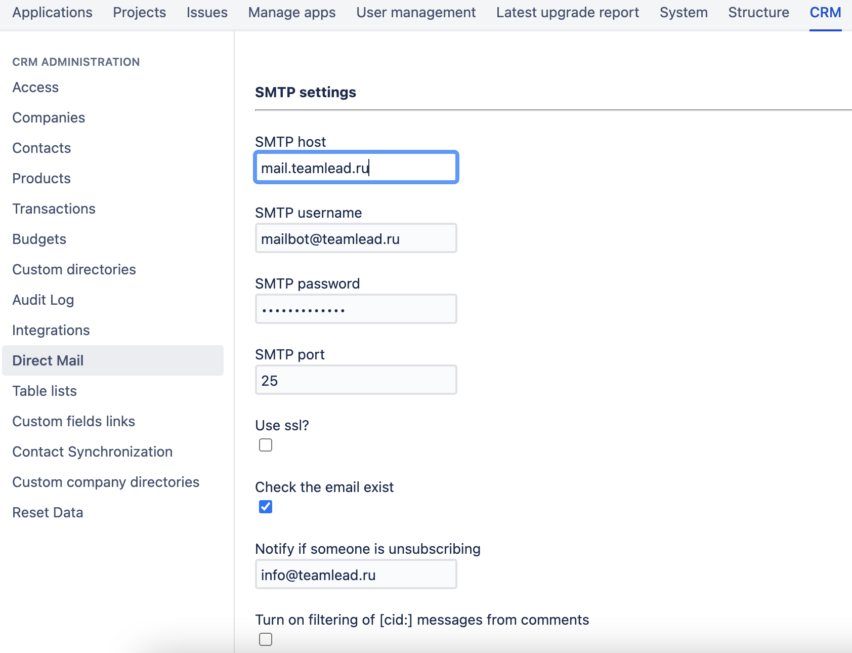 As the administrator, you can specify which group(s) of users will be allowed to use the direct mailing in CRM. Navigate to CRM settings → Access → Other Permissions to select the relevant groups. If no groups selected, no one will be able to send emails to contacts directly from CRM Contacts Directory.