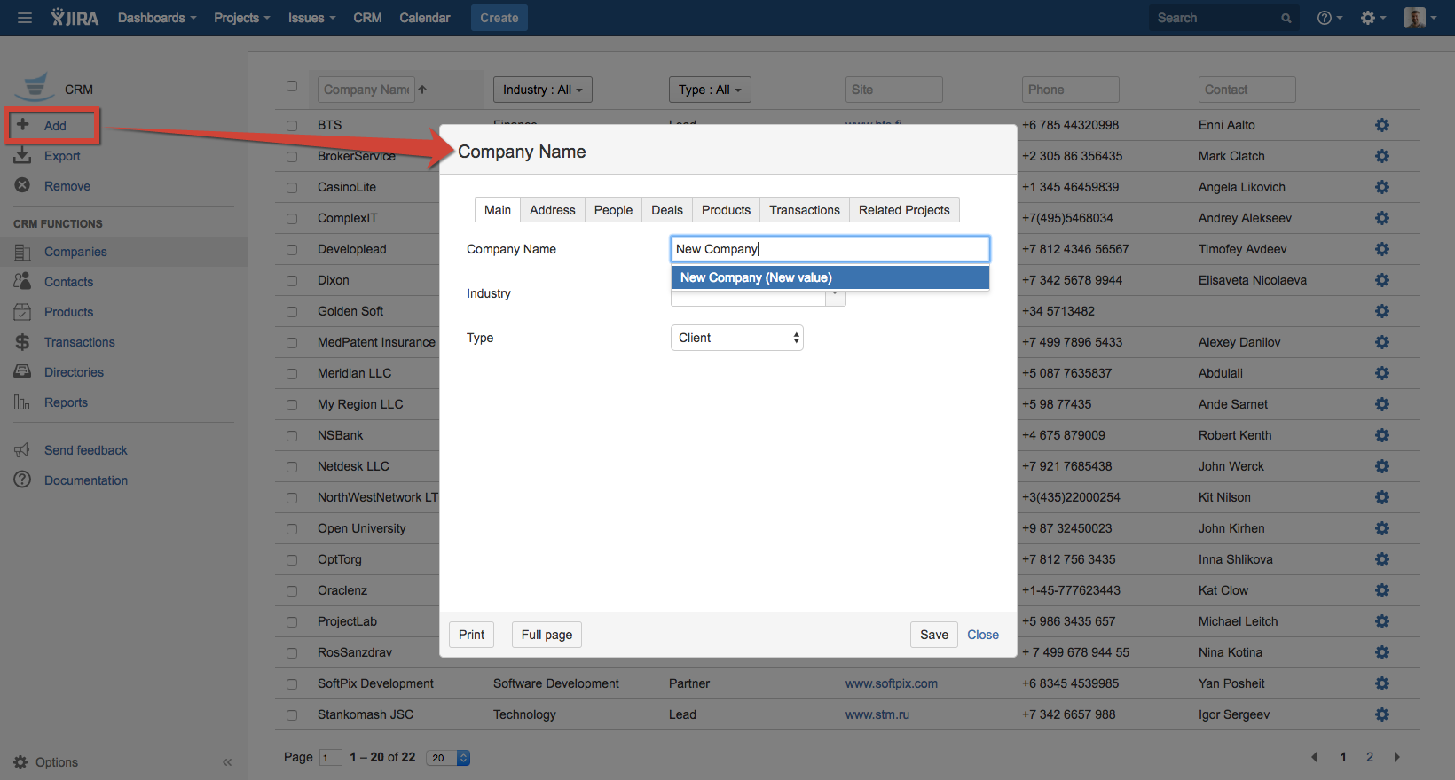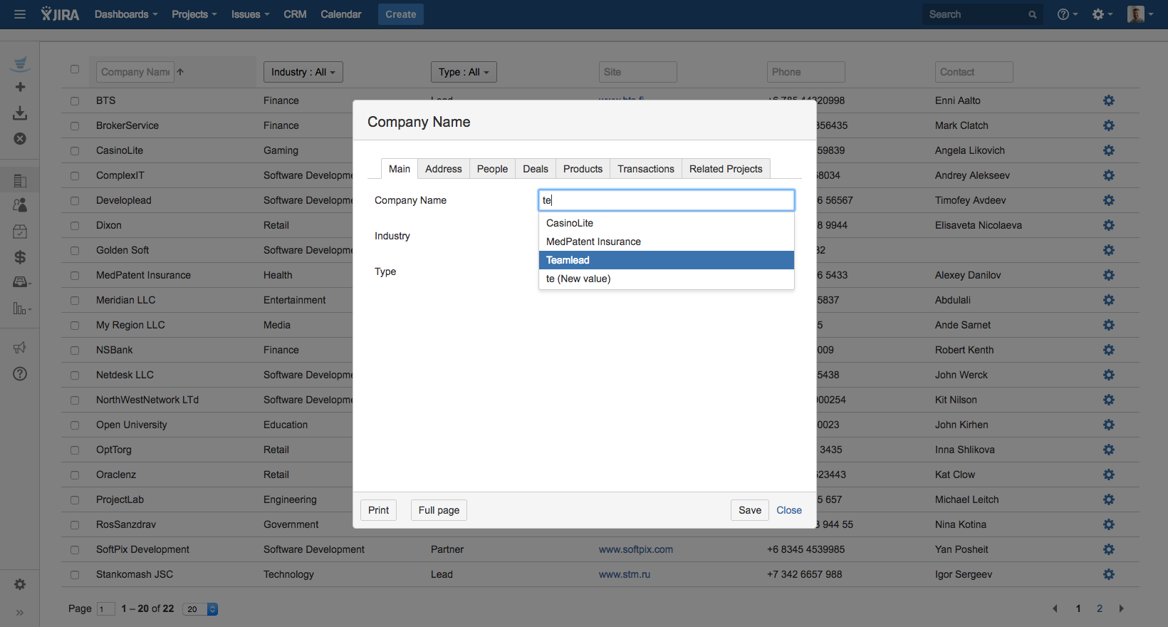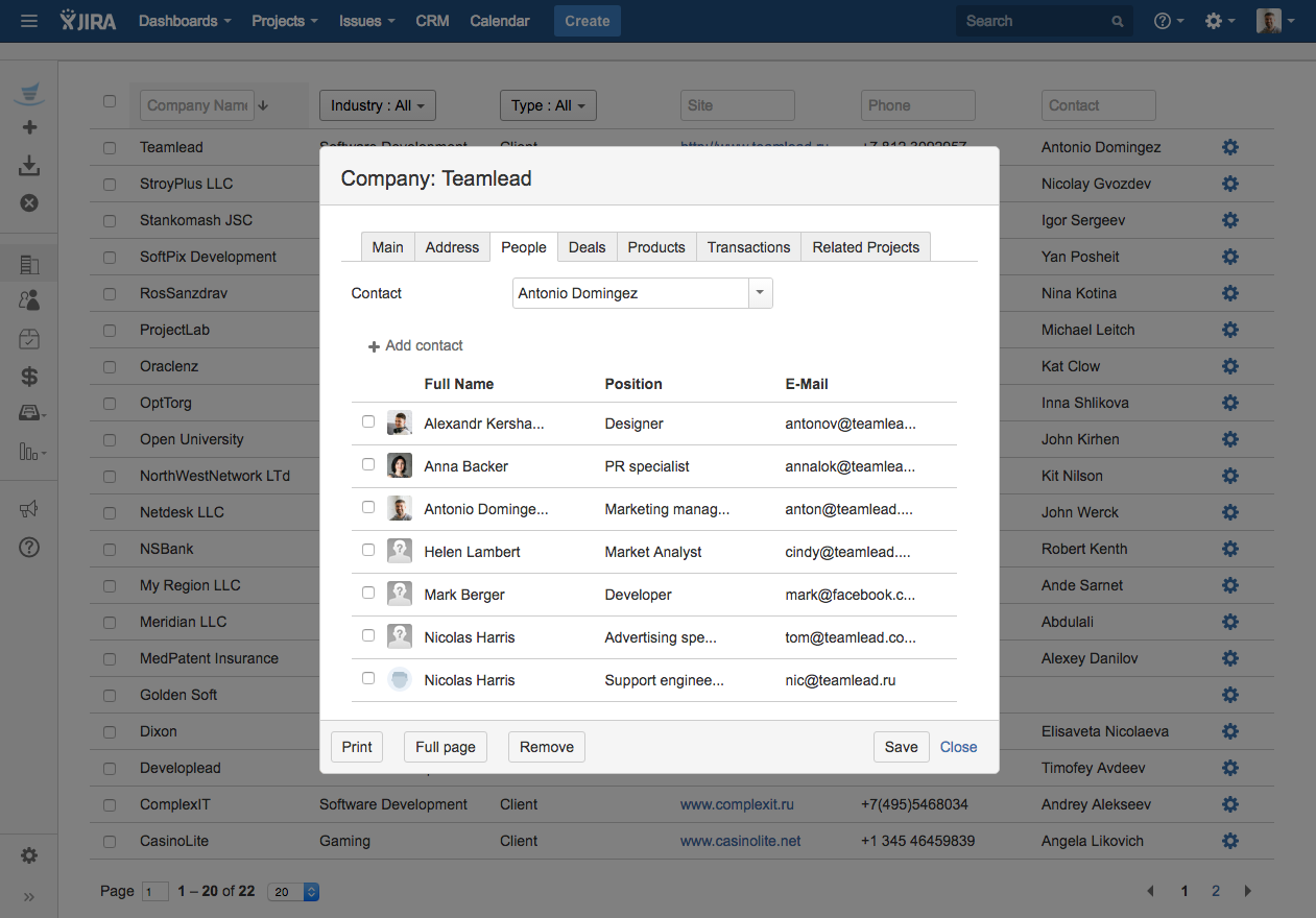 Many companies that use JIRA for internal and external business processes face problems with building Service Desk and CRM solutions. The problem is that JIRA has no Company dictionary so it is impossible to associate tickets or sales with customers. JIRA Users Dictionary has only Full name and e-mail fields and doesn't provide an opportunity to keep such information as Position, Phone number, or Company.