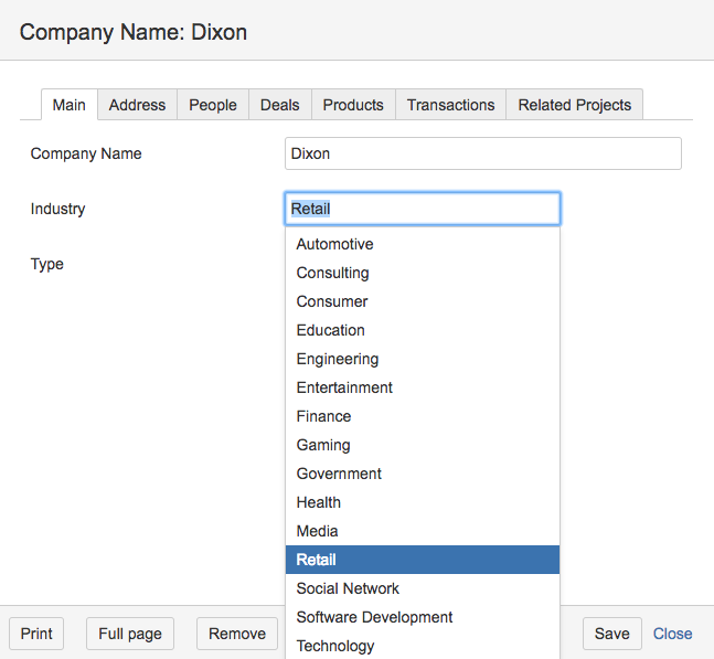 Notice that the Company name field is intelligent. If you start typing a new company's name - the system will display existing records from the dictionary with similar names.