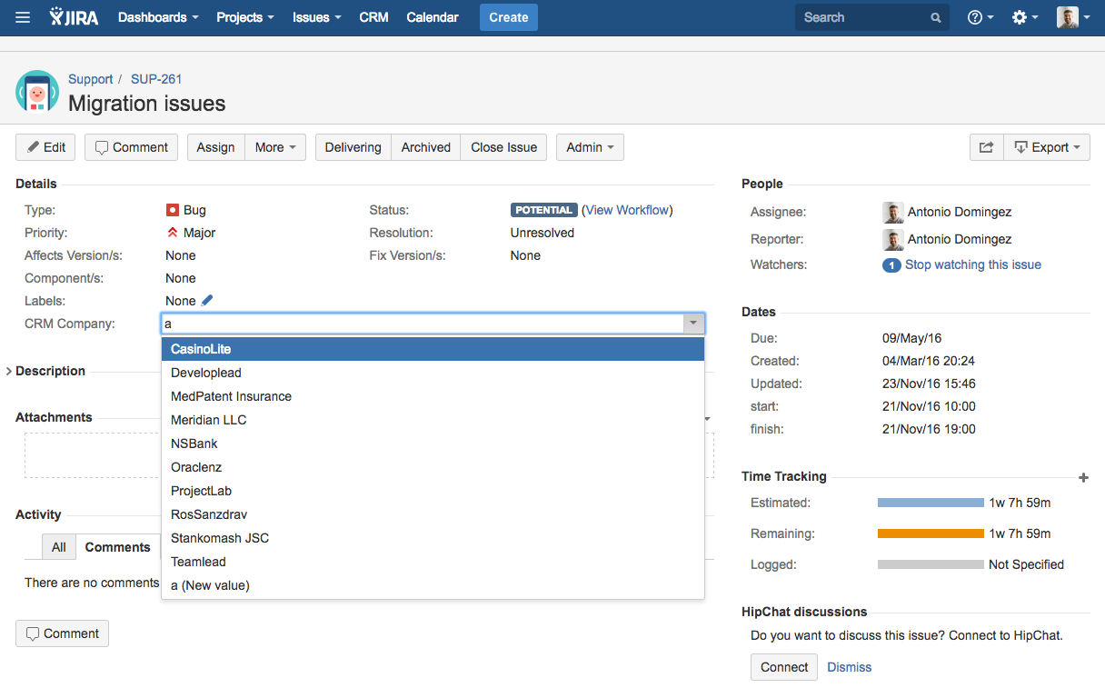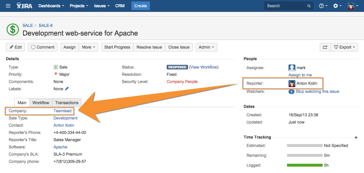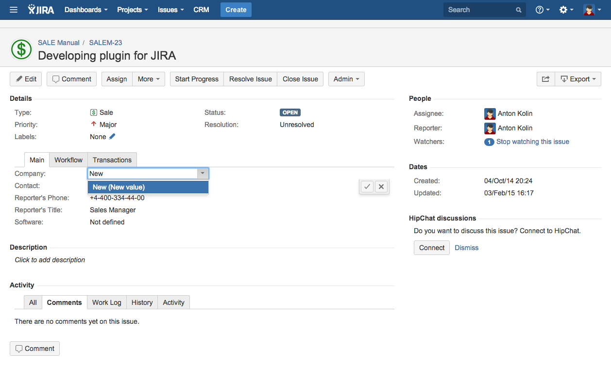 There are situations when it is necessary to create an organization directly from the JIRA issue. CRM plugin automatically determines the company by issue reporter almost in all of our projects: