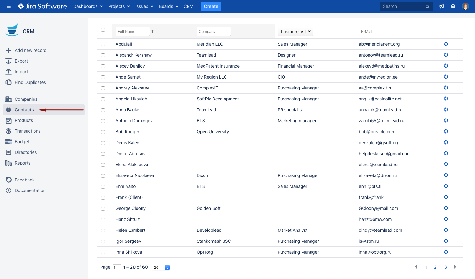 After installing plugin you will see new Contacts Dictionary in JIRA. This dictionary relates to Companies Dictionary. This means that contact can be added to company. Contact Card attributes can be configured by JIRA administrator as needed.