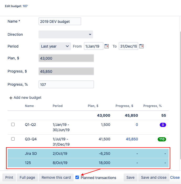 In the example below, the 43k plan was added manually, the 45,850k progress is the sum of fact-transactions for the specified period. The dates are selected as an additional filter.