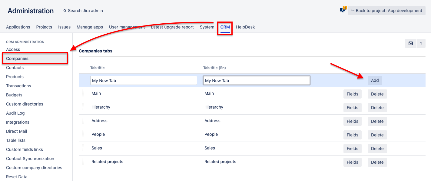 Navigate to CRM Administration → <required directory> and add a new tab specifying the tab name.