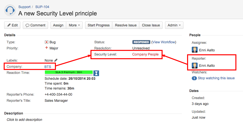 To resolve the access problem you need to add unique security level principle Company People to your Security Level Scheme: