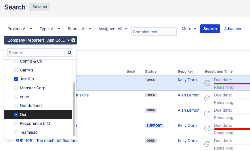 Reporter in CurrentUserCompany() | To find the issues where a User Picker contains users from the same CRM company as the one performing the search. |