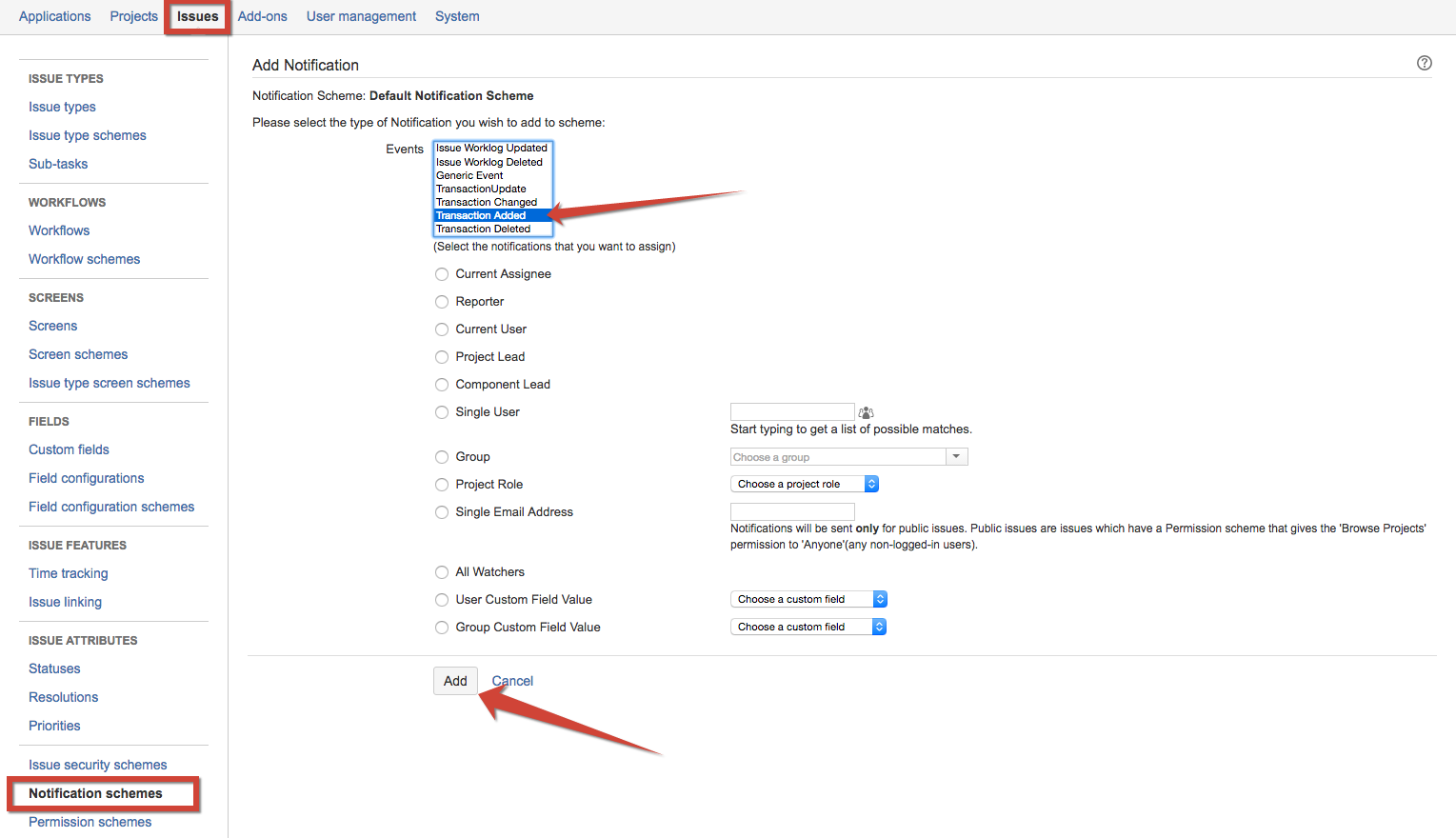 Go to Administrator menu/ Issues/ Notification Schemes, find in the table Transactions Events (Transaction Added, Transaction Changed, Transaction Deleted) and press 'Add' to add groups, roles or users to receive notifications about correspondent event.