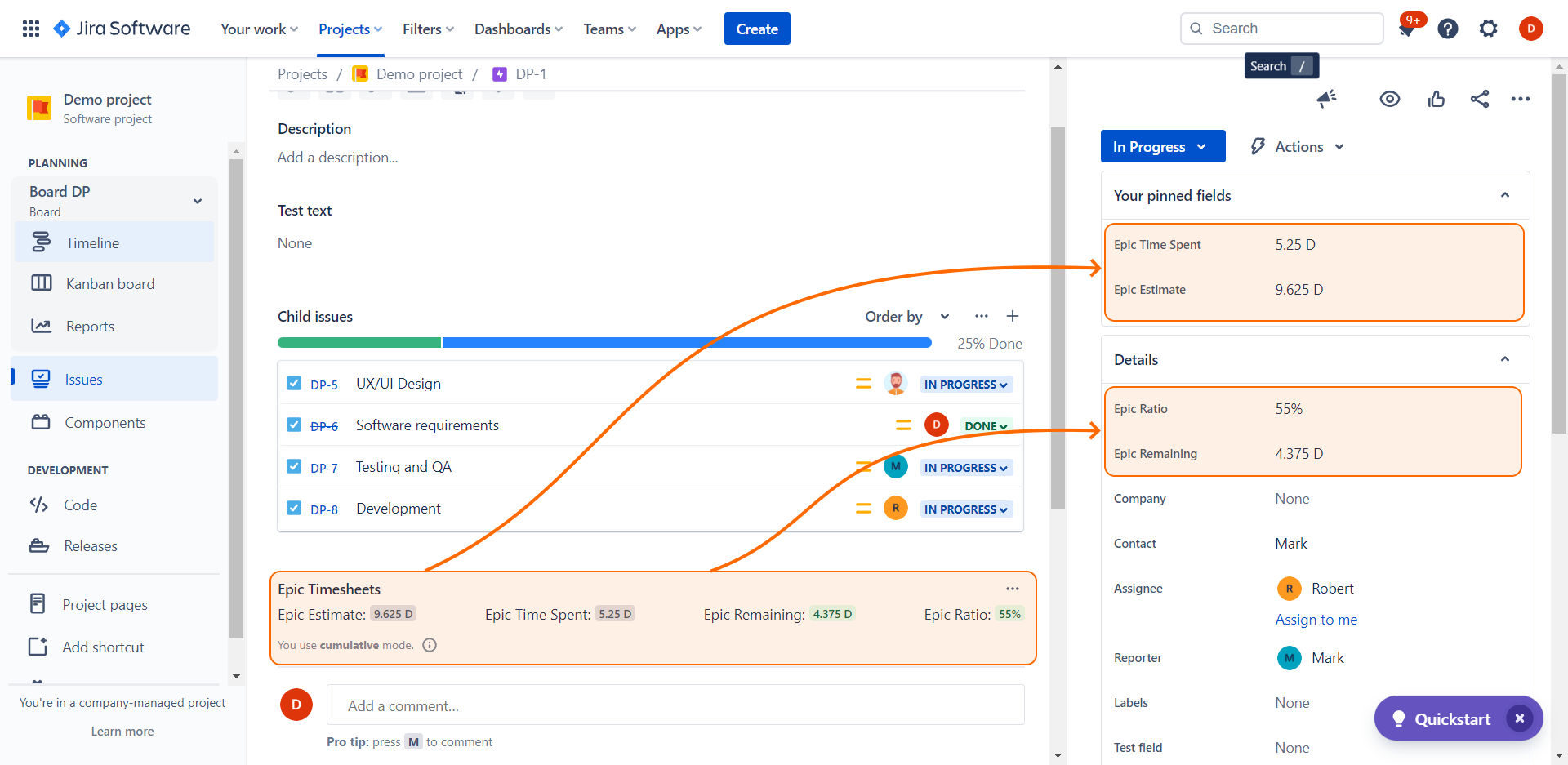 Epic Time Spent – logged time of the Epic, summing up the work logs of the Epic itself and the work logs of the Epic's child issues;