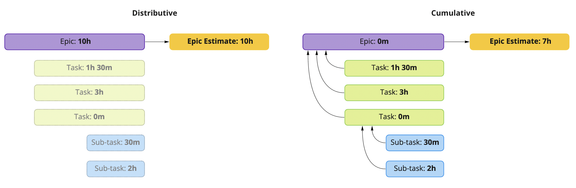 Your epic estimate is the summed-up estimates of the included issues. Set estimates for each issue and manage the scope of tasks to update the overall Epic estimate. This variant is convenient for works planning and is called "cumulative".