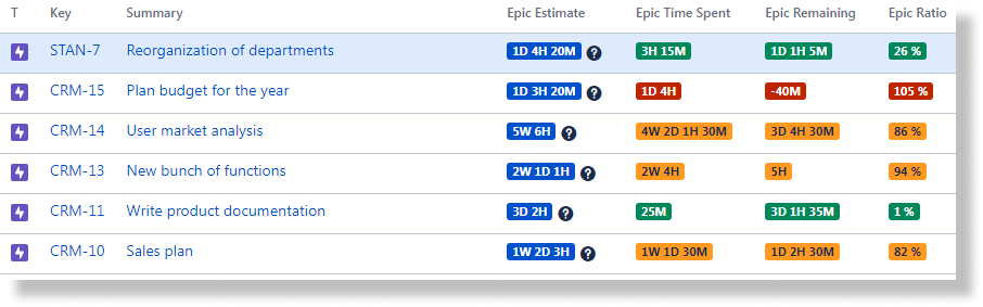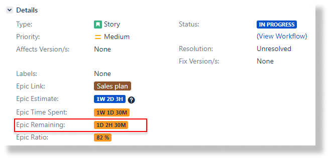 Epic Time Spent – logged time of the Epic, summing up the work logs of the Epic itself and the work logs of the Epic's child issues.