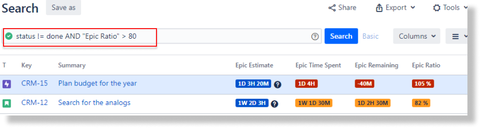 Reveal the problems using JQL: Create a JQL filter to browse the issues with specific Epic Ratio