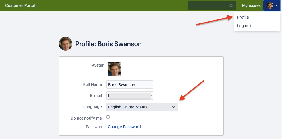 A user will see their profile-relevant language translations on the Portal if this translation is available. If it's not – a user will see the original entity name. The language can be selected at the login window as well as in profile settings. By default, your customers will have the default system language in their profile.