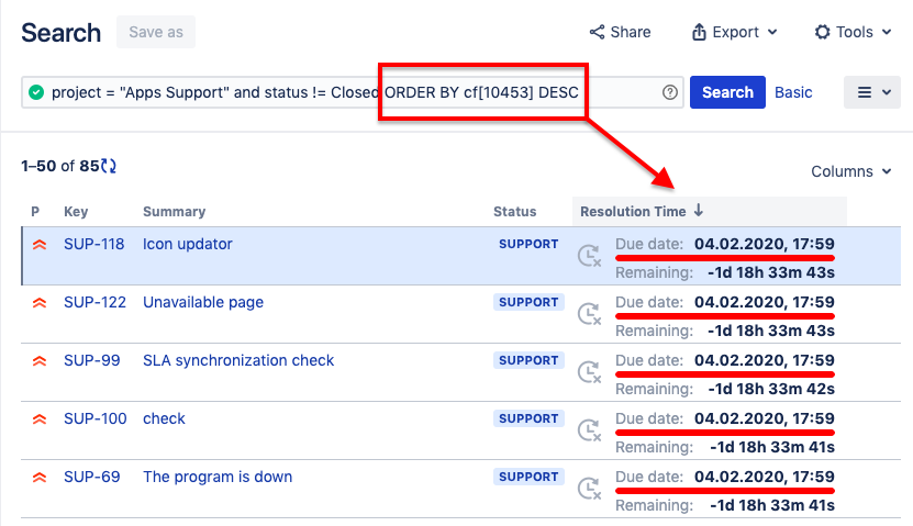 Set up a queue with overall SLA, team SLA or both for more visual clarity. In the examples below, you can see the queue sorted by the overall SLA and the queue sorted by team SLA. This second queue demonstrates that teams working with the issues sometimes breach their time limits that can be a signal to a manager about overall SLA risks.