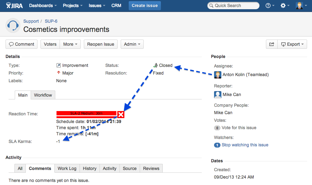 With SLA Karma we could control SLA violations by assignees. HelpDesk stores SLA Karma in the issue field (type Number). HelpDesk check violation of SLA if the assignee closes the issue (or resolves it). If there is a violation of SLA, HelpDesk stores negative points to the SLA Karma field. If there is no violation of SLA, HelpDesk stores positive points to the SLA Karma field. So, during working with issue assignees could increase or decrease points. We could track if an issue will has a negative SLA Karma value.