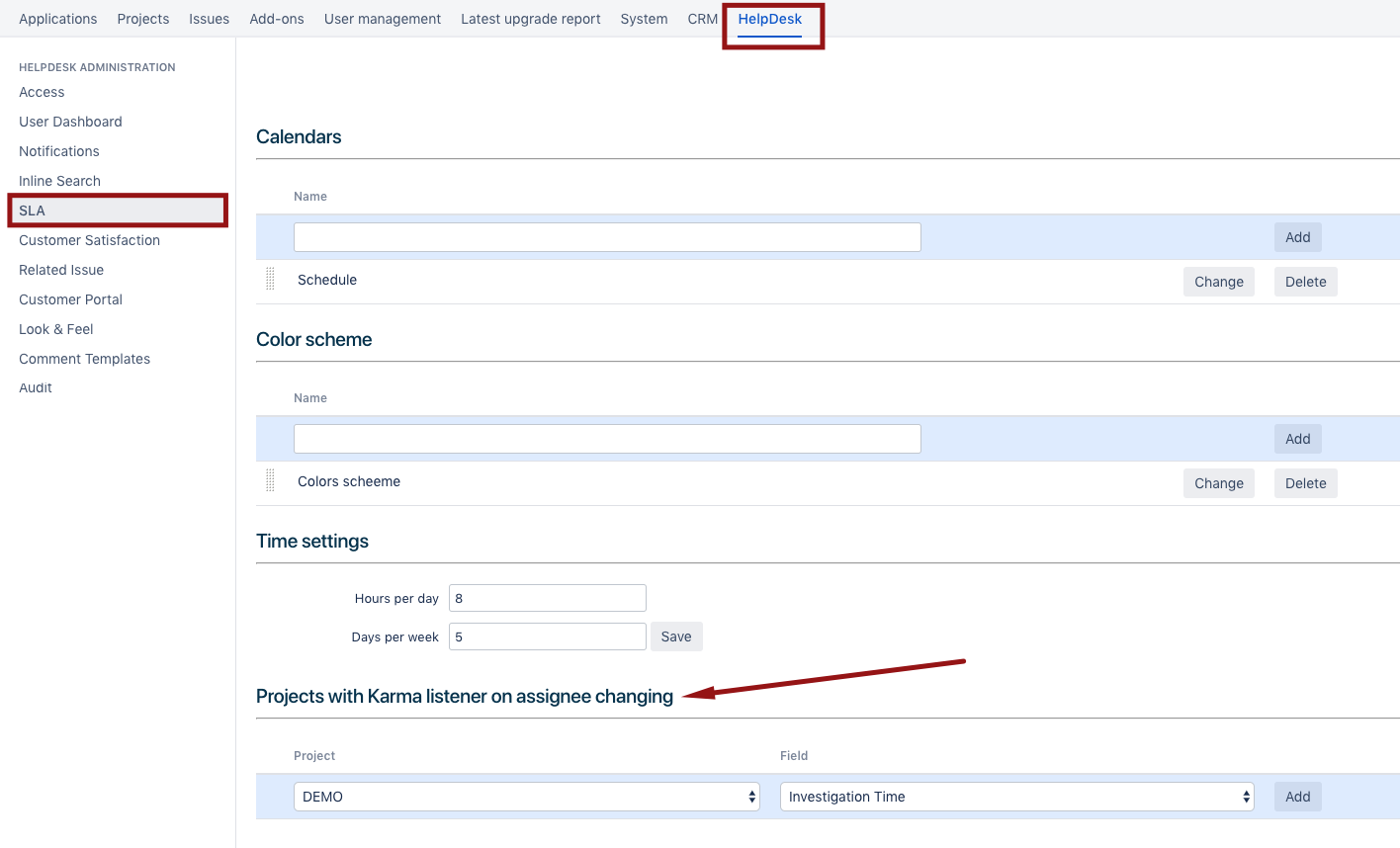 Although, we could add a special listener "Issue Assignee" to catch assign events. If SLA normative is violated, negative Karma will store to the first assignee, but a new assignee. To do it, go to the Administration/HelpDesk/SLA Settings and choose affected by listener Projects and SLA fields: