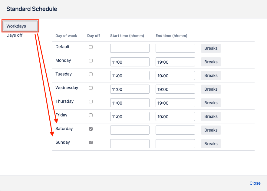 Change the calendar schedule (the default one for a new-added entry is 8am-6pm daily) by clicking the Change button and defining the start and end time for the working days.
