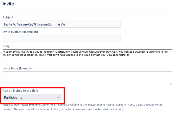 Note that if this field is selected and the invitee doesn't have an account in Jira, a new account will be created. The new user will be included in the groups for a new user (see the Permissions section).