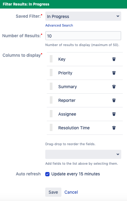 3. Add the Filter Results gadget on the Dashboard. Set up the gadget parameters.