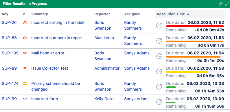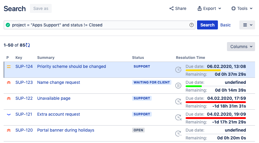 Set up a queue with overall SLA, team SLA or both for more visual clarity. In the examples below, you can see the queue sorted by the overall SLA and the queue sorted by team SLA. This second queue demonstrates that teams working with the issues sometimes breach their time limits that can be a signal to a manager about overall SLA risks.