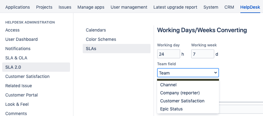 Specify the Working Days/Weeks Converting rules. The SLA goal hours will be converted to days and weeks according to these rules. For example, if you select the working day = 8h, the 10h SLA goal will be displayed as 1d 2h. If you prefer to count the time in the calendar days/weeks, leave the default 24/7 setting.