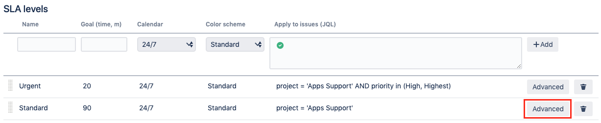 SLA levels: Goals and filters that specify the issues those goals should be applied to;
